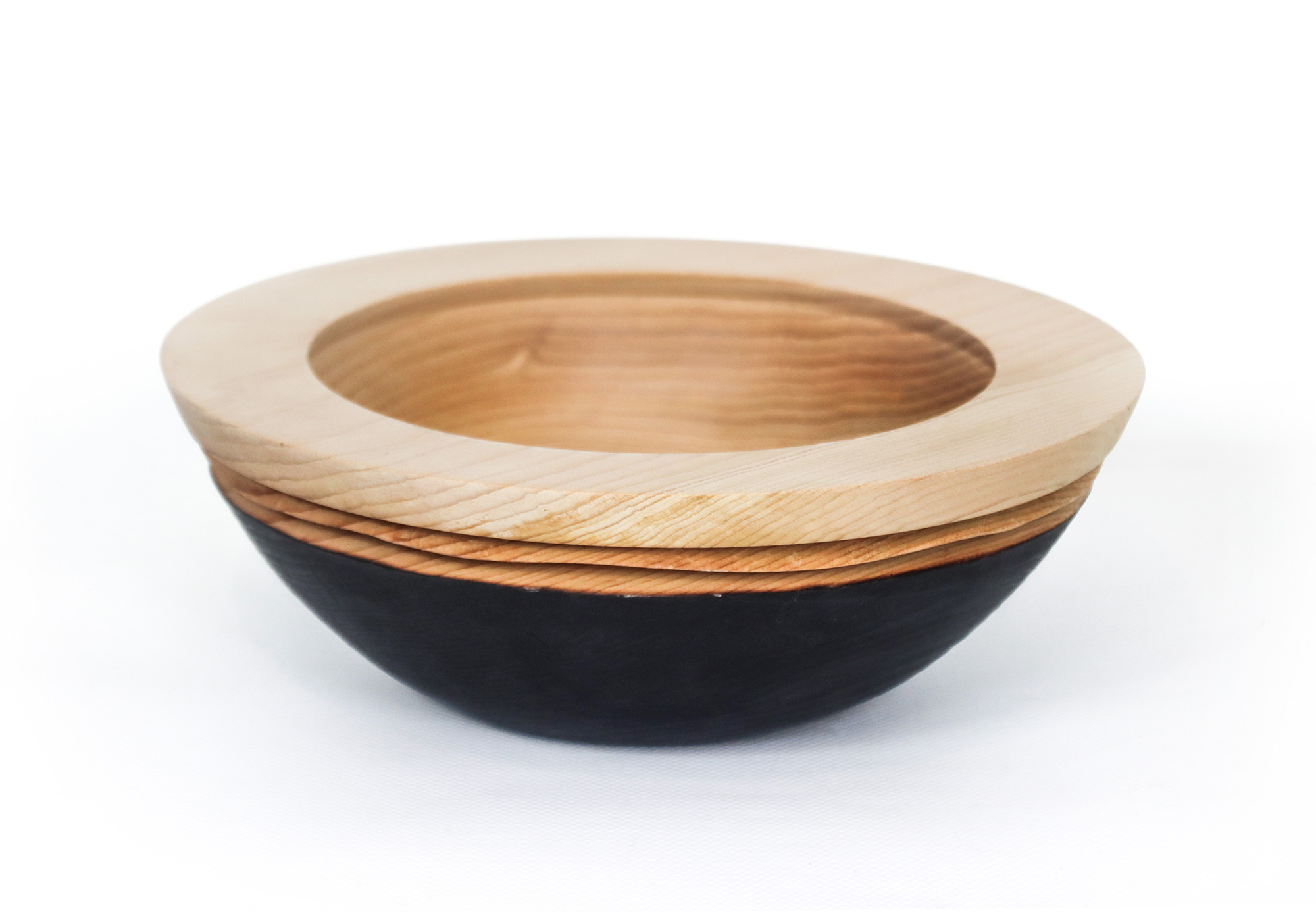 L’usage du brûlage pour noircir les pièces, en contraste avec une couleur de bois naturellement claire ou obtenue par blanchissement, a donné naissance à cette collection basée sur le noir et blanc.